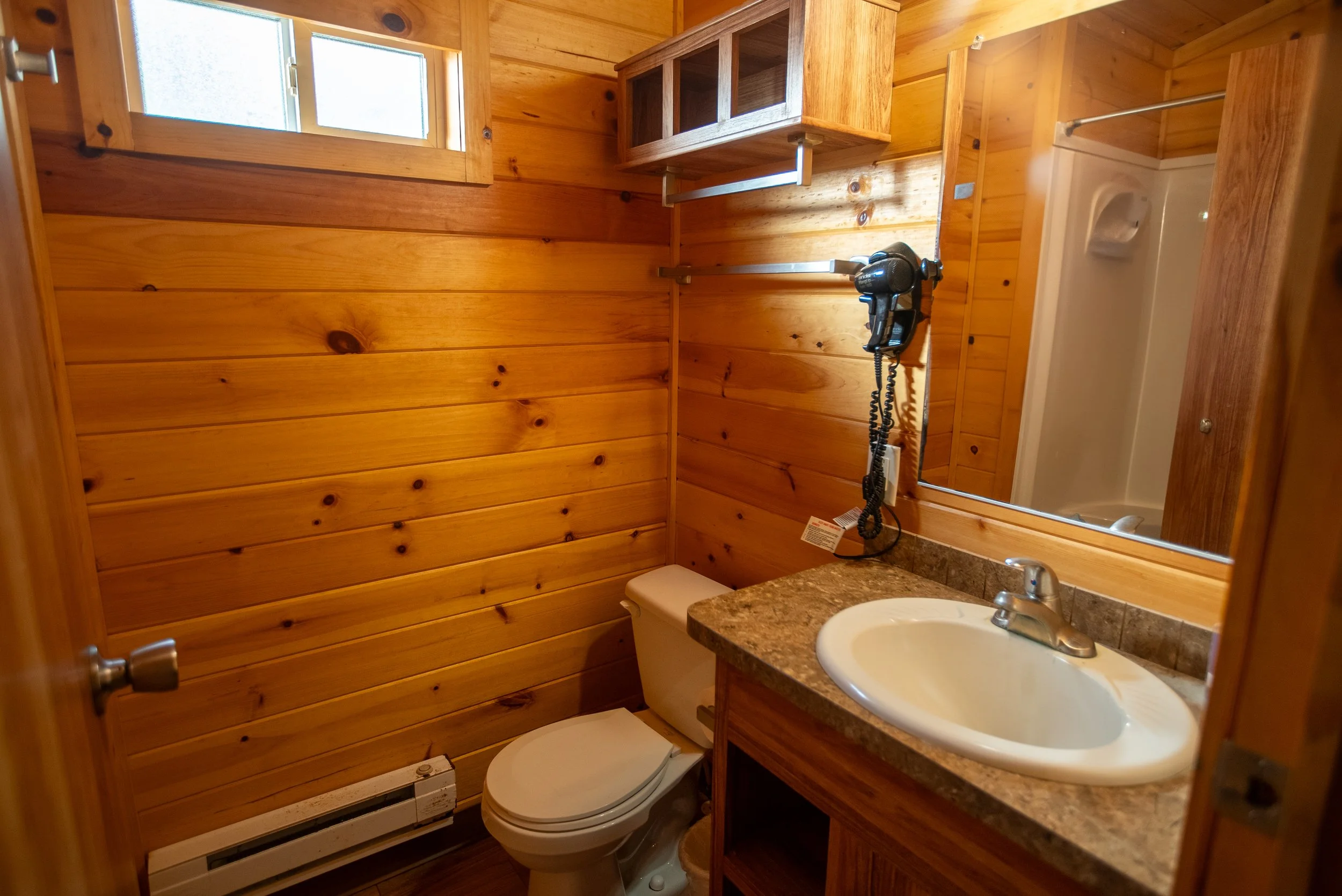 Our Cabins are 12 feet x 12 feet with an attached full bathroom. Our cabins will comfortably sleep 4 people with a double bed and a bunk bed. They have a covered porch, outside charcoal grill, cable TV, microwave, coffee pot and small refrigerator. They have air conditioning and a heater. Cabins also offer a fire place and a picnic table.
